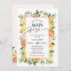 Convite de chá de noiva com tema de citros com uma moldura de limão, laranja e rosas cor-de-rosa e palavra de caligrafia moderna. Este ela encontrou seu amor moderno é ideal para um chá de noiva com tema de citros ou limão.