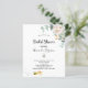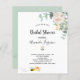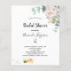 Um convite para uma noiva. Um fundo branco chique. Decorado com flores brancas pintadas à aguarela (peônia) folhagens de eucalipto, folhas e raminhos, e uma abelha feliz sorridente carregando um envelope. Personalize e adicione um nome e detalhes da festa. Letras pretas. O texto: Chá de Noiva e o nome da futura noiva são escritos com um estilo de letra manuscrita moderna.