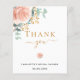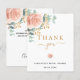 Um cartão moderno e elegante de agradecimento de chá de noiva. Um fundo branco chic. Decorado com rosas rosa e dourado, flores e folhas de eucalipto pintadas à mão em verde, raminhos, folhagens e raminhos dourados falsos. Letras pretas e douradas. Na frente, o texto: Obrigado, nome e data.