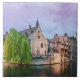 Pintura da cidade antiga de Bruges e da torre de Belfry com céu cor-de-rosa durante o pôr do sol, Bruges, Bélgica.