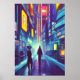 Duas pessoas andam pela rua em uma cidade à noite, com muita luz vindo do prédio ao redor da rua a pessoa andando. Esta é uma arte gerada por IA.