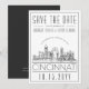 Um convite de casamento único "Save the date" para um casamento que acontecerá na bela cidade de Cincinnati, Ohio. Este convite apresenta uma ilustração estilizada da paisagem urbana única da cidade com seu nome embaixo. Isso é seguido pelas informações do seu dia de casamento em um estilo de linha aberta correspondente. No verso do convite há uma cor cinza escuro para complementar a aparência e a sensação. Todos os elementos individuais do cartão de convite são desbloqueados, então sinta-se à vontade para alterar quaisquer detalhes necessários, como tamanhos de fonte, estilos e muito mais, usando a função de personalização. Você pode adicionar uma foto ao verso e aplicar um filtro preto e branco a ela. Divirta-se sendo criativo e tornando-o seu!
