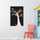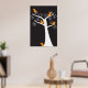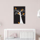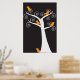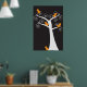 Cinco adoráveis pássaros abstrato-laranja saem em uma árvore branca contra um fundo preto em um poster