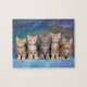 Fotografia de cinco gatinhos de mesa sentados em fileira.
