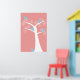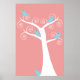 Cinco adoráveis pássaros azuis abstrato pendurados em uma árvore branca contra um fundo cor-de-rosa em um impressão