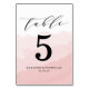 Cartões de mesa de casamento elegantes, com um fundo de lavagem de cor-de-água cor-de-rosa pincelada, com letra de caligrafia à mão. Personalize os cartões numéricos da tabela na moda com seu nome e data de casamento para uma aparência personalizada.