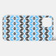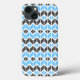 Este gabinete iPhone 13 apresenta um padrão geométrico colorido de herringbone em azul, cinza escura e branco.