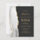 A borda esquerda deste elegante e moderno convite de aniversário 50º apresenta uma cinza e uma aquarela branca, borda agitada com brilho dourado. O texto personalizável combina manuscrito dourado, fontes em copperplate e itálico em um fundo preto de slate. O lado inverso apresenta um design agate correspondente.
