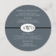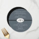 Modelo de cardápio redondo com monograma no centro. Preto neutro, cinza e branco com quatro seções para aperitivos, salada, entradas e seção de sobremesa em texto impresso branco. Adicione três iniciais (monograma de casamento) ao oval branco central. O reverso é preto. Precisa de outras cores? Peço ajuda, e terei todo o prazer em criar-lhe!