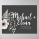 O símbolo de casamento moderno apresenta tons brancos/neutros de aquarela canto floral sobre a cinza de papoila com blocos de texto personalizáveis brancos em fontes modernas