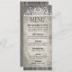 Este menu impressionante do comprimento do chá de minha coleção "filigrana" de madeira rústica caracteriza o branco translúcido filigrana sobre um fundo cinzento rústico do woodgrain. O corpo do menu é ajustado contra um painel do pergaminho cinzento envelhecido. Use "personalizam-no" botão para adicionar seu próprio texto no traseiro e dianteiro do menu. Convites de harmonização do casamento, cartões salve a data, etiquetas do favor, obrigado cartões, cartões da resposta de RSVP, selos postais e mais estão igualmente disponíveis. Para perguntas, a ajuda ou os pedidos feitos sob encomenda, enviam-me por correio electrónico: glamprettyweddings.com/contact. Design original "filigrana" de madeira rústico pelo © 2014 de Cheryl Daniels.
