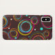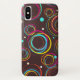 Proteção para o seu cobrir de estojo, castanho e círculos multicoloridos. Desenhada por Sarah Trett.