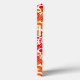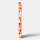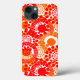 Essa capa de telefone tem um design de círculos decorados com linhas e círculos feitos de pontos repetidos em vermelho e laranja.