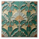 Um painel de alivios de arte quadrada com um design simétrico, com modos florais estilizados e ventiladores em uma paleta de verde, creme, branco e laranja. O painel é dividido em quatro seções, cada uma com um padrão repetitivo. Os elementos verdes assemelham-se a folhas estilizadas ou pétalas, com arestas levantadas e superfícies lisas. As áreas de cor creme aparecem como formas de fundo, o que contrasta com o verde. As formas brancas e laranja do ventilador estão localizadas centralmente, adicionando um ponto focal ao design. O alivio é detalhado, com profundidades e texturas variadas que criam um efeito tridimensional. O estilo geral lembra as artes decorativas do início do século 20, com foco em formas geométricas e motivos naturais.