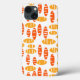 Esta capa de telefone tem um padrão repetitivo de ovais em cor de laranja retrô e amarelo com ovais brancos dispersos todos em um campo de branco.