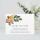 Um cartão de inserção de solicitação de livro para o chá de fraldas. Apresentando fruta de laranjas e limões em um galho verde e poema: "UMA PEQUENA SOLICITAÇÃO, ESPERAMOS NÃO MUITO DURO POR FAVOR TRAZER UM LIVRO EM VEZ DE UM CARTÃO QUE ELES CHERARÃO O LIVRO, BEM AMADO OU MARCA NOVO POR FAVOR ASSINEM O DENTRO COM UMA MENSAGEM DE VOCÊ!"