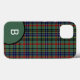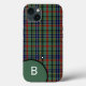 Capas de iphone bonita feita no tradicional clã escocês bisset tartan padrão. Um disco verde, no canto inferior esquerdo, tem um monograma branco de letras de solteiro pronto para personalizar.