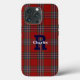 capas de iphone na moda feita no bonito padrão clássico de xadrez tartã MacFarlane, verde, vermelho, branco e clã azul. Personalize o grande monograma azul e o texto branco menor para atender às suas necessidades. Faz uma ideia personalizada de presente de excelente.