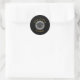 Um adesivo que diz: Classe 20xx Parabéns. Colocado sobre um fundo preto. Ilustrado com um boné de formatura preto com um círculo semitransparente atrás. Elegante e chic.