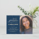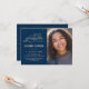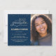 Esta elegante e festiva Festa de formatura de 4,5" x 6,25" Photo Invitation apresenta um confetti dourado (simulação de folha) com as palavras "Classe de Formando 2025" mostrando em uma fonte dourada. Há uma área de fotos personalizada para sua foto do formando. O fundo é azul, mas pode ser alterado para qualquer cor de sua escolha. Os detalhes da celebração podem ser facilmente personalizados para seu evento especial (como o nome do segundo grau). A parte traseira da placa apresenta um padrão pontilhado em ouro, também com um fundo azul que você pode personalizar de acordo com o seu gosto. Uma forma simples e bonita de convidar convidados para comemorar a formatura.