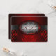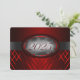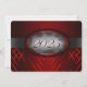 Convite à graduação de vermelho e prata com listras vermelhas claras e escuras e uma fita prateada passando mostrando o ano de graduação. A parte traseira da placa é vermelha com fonte prateada clara para as pessoas preencherem os anúncios de graduação.