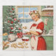 Numa cozinha confortável e coberta de neve, a Sra. Claus é capturada no meio de assar de férias. Vestida com um vestido vermelho festivo com capas aparadas de pele, e um avental correspondente, ela sorri muito bem enquanto prepara um novo lote de biscoitos. A cena é cheia de alegria natalícia, completa com uma árvore maravilhosamente decorada, enfeitada com canas doces e ornamentos vermelhos, enquanto a neve suavemente cai fora da janela, adicionando à atmosfera mágica da estação.