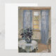 Stue Med Lyseblå Gardiner og Blå Clematis, Sala de estar com cortinas azul claro e clematite azul (1913) de Anna Ancher é uma pintura artística de impressionismo antigo. Cortinas azuis transparentes estão penduradas sobre a janela com luz solar quente de verão a entrar. Uma planta de flores de clematite do jardim está numa mesa no estúdio do artista.