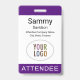 Personalize nosso crachá de participante profissional com o logotipo do evento, o nome do participante e outro texto personalizado. É plástico pvc e disponível com um jardim, clipe ou um rolo retrátil. Projetado em roxo real e outras cores com uma design moderna minimalista do MISOOK. Todas as cores são personalizáveis. Você pode, opcionalmente, adicionar outro conteúdo ao verso (código QR, termos etc.). Personalize facilmente o título do participante (convidado VIP, visitante, auto-falante etc.). Nenhuma quantidade mínima de ordem e nenhuma taxa de configuração. Todas as encomendas são satisfeitas pela Zazzle em produtos do Zazzle. O MISOOK NÃO tem suas informações de personalização, envio ou cartão de crédito, portanto entre em contato diretamente com a Zazzle para fazer perguntas, inclusive sobre como personalizar seu design.