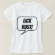 CLIQUE EM CONFIAR! COMA VIDRO! Chá de mulher básica. Camiseta dupla, CLIQUE EM RUST! na bolha de fala na frente de T-Shirt e EAT GLASS! na bolha de fala na parte traseira da T-Shirt.