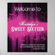 Um fundo cor-de-rosa brilhante e manchado contra preto rico dá a esta poster Doce 16 a aparência de uma boate ou de um folheto de eventos. Perfeito para os adolescentes e seus amigos que amam a vida noturna e se divertem! Uma mensagem de boas-vindas ou outra impressão no topo acima da massa magenta granulada que compensa o seu nome e as palavras "Doce Dezesseis" reproduzidas num estilo de ornamentado. Use como sinal de boas-vindas para seus convidados e adicione uma mensagem especial para todos verem.Disponível em cores alternativas com produtos correspondentes.