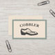 Um cartão de visita simples e elegante com uma ilustração de um calçado e informações personalizáveis, em cores bege, preto e verde. Perfeito para atividades como reparo de calçados, inicializador, reparo de calcanhar, compro de calçados etc.