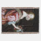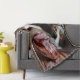 Uma mulher vestida de cetim vermelho com um xale puro segura um buquê de flores enquanto sopra uma grande pastilha elástica. A roupa histórica e o penteado sugerem uma era passada, mas a pastilha elástica introduz uma reviravolta lúdica e moderna.