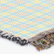 "A woven blanket with a subtle green and beigহe checked pattern displayed horizontally and vertically. It has brown tassels along the edges."