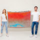 Um design abstrato de um pôr do sol oceânico com cores ousadas em vermelho, laranja, ciano, azul e bege.
