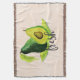 Um cobertor de arremesso com a palavra "fresco" desenhado com uma vibrante pintura aquosa de um abacate de cheio emparelhado de meio abacate sentado sobre uma cama de folhas. Sombras verdes e amarelas vívidas fazem com que esta fruta ganhe vida. Colocado sobre um fundo colorido de pêssego.