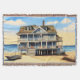 Jogue em uma ilustração de uma casa de praia idílica em assoalhos diante do oceano tranquilo, com um pequeno barco descansando na costa arenosa. O céu é brilhante e parcialmente nublado, somando-se à atmosfera litorânea serena.