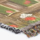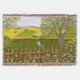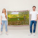 A fleece blanket with a beautiful image of a nature scene: A bird sitting on a weathered fence, wildflowers growing around the fence, a farmer on a tractor, working his land, trees fall leaves, and farmland of various colors. Original artwork by W.B.