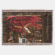 Dragão Vermelho sentado no computador, lendo um livro. Por trás está o equipamento de podcasts, o computador e seus tesouros.