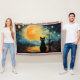 Animais engraçados, cidade noturna e céu estrelado. Um gato preto bonito está olhando para o céu estrelado inspirado por Vincent van Gogh. Paisagem de fantasia colorida. Pintura digital a óleo, belas artes.