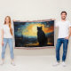 Animais engraçados, cidade noturna e céu estrelado. Um gato preto bonito está olhando para o céu estrelado inspirado por Vincent van Gogh. Paisagem de fantasia colorida. Pintura digital a óleo, belas artes.