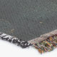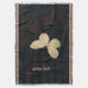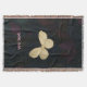 A imagem mostra um cobertor tecido com uma borboleta grande de ouro no seu centro sobre um fundo texturizado escuro com tons sutis de roxo e azul. O cobertor tem bordas franjas e inclui o texto personalizável de marcador de posição "texto" rosa ao longo do lado.