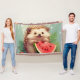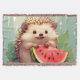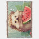 ilustração encantadora de um ouriço desfrutando um pedaço de melancia. O ouriço tem uma expressão feliz, com os olhos fechados em deleite, e está cercado por alguns morangos e folhas. O estilo de desenho de tinta adiciona um toque brilhante e fofo à cena.