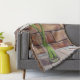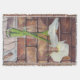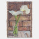 Uma pintura aquosa de dois lírios brancos elegantes num vaso de vidro transparente com parede de tijolos como fundo.