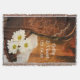 Personalize o encantador jogo das margaridas brancas e do cowboy boots Country Western Wedding com os nomes da noiva e da cerimônia de noiva e casamento para criar um presente de guardião para uma festa de noivado, chá de panela ou casamento. Este cobertor nupcial do estilo rancheira, bem acolhido, apresenta uma fotografia floral, quase digital, de um par de botas de cowboy de couro castanho com um buquê de flores margaridas brancas e um véu branco, de castanho, com fundo de madeira de celeiro de couro castanho.