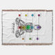 Um cobertor tecido com design de uma pessoa em uma pose meditativa, cercado pelos sete chakras. A pessoa é desenhada em linhas pretas e está sentada numa posição de lótus. Os chakras são representados por círculos coloridos, cada um com um dentro de símbolo diferente. Os chakras são rotulados com os nomes sânscrito: Sahasrara, Ajna, Vishuddha, Anahata, Manipura, Svadhisthana e Muladhara. As palavras "As 7 Chakras do Corpo Humano" são escritas no fundo do cobertor. O cobertor tem uma borda em todos os lados.