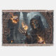 Chamas Góticas, a guardiã dos dados queimados. A figura do Grim Reaper situa-se no meio de um círculo de dados queimados, lembrando pequenas fontes de incêndio e sugerindo energias mágicas ou apocalípticas. O fundo escuro e turvo reforça a atmosfera mística e sombria.