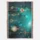 Chaves Douradas e antigas com engrenagens e marcadores penduram em correntes douradas sobre fundo verde luminoso.