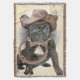 Filhote de cachorro preto adorável de caracterização geral do buldogue francês do estilo ocidental que veste o chapéu de vaqueiro resistido e que guardara o laço.