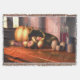 Este cobertor apresenta uma pintura digital de uma vida estática sazonal com uma abóbora, milho indiano e uma cornucopia cheia de maçãs e peras pela artista Jayne Wilson.