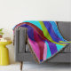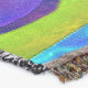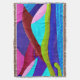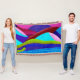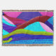 Uma paisagem abstrato colorida de colinas e um oceano de cores rosa, roxo, azul, verde e ciano.